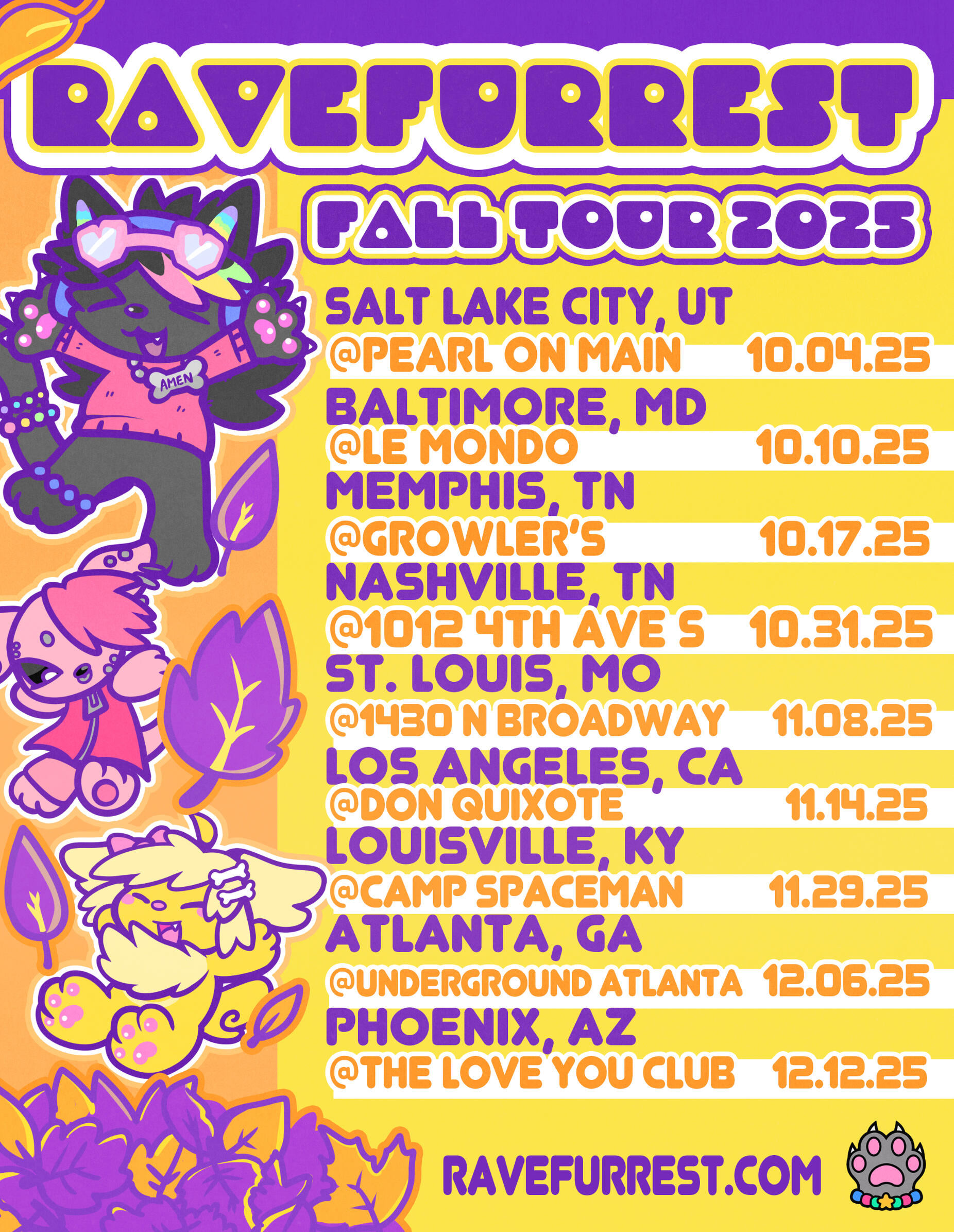Because we book our events in multiple venues and states, please keep in mind our main attendance policy specifically applies to our home base in Nashville. Some events may be 21+ rather than 18+. Some events may have food and drink available and some may not. This does not change the code of conduct, and above all, PLEASE respect venue's staff and Ravefurrest staff alike!