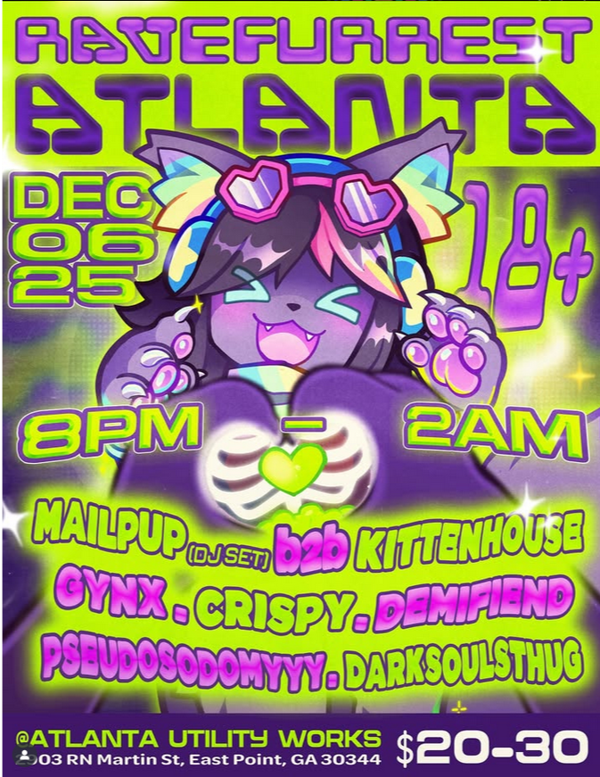 Sending an application communicates that you would like to DJ at Ravefurrest.We prefer hyperpop, breakcore, oldskool rave, trance, happy hardcore, jungle, hardcore breaks (generally, dance music). If you do not make music like this you will probably not fit our event.If your music doesn't fall perfectly into these categories, that's ok! If there are elements from these genres please submit your work - do not feel discouraged if it's not a perfect fit.In your application, please send a mix of your music. It is best if it is a DJ mix or live set. Soundcloud, bandcamp, Youtube - wherever you post it is fine! Please do not send links without make sure they are shareable (google drive, dropbox, etc). All submissions that are just links with no other words will be counted as spam automatically.Please write a sentence about why you want to DJ at Ravefurrest.Understand we have a certain number of set slots each event. We fill them quickly and we have to coordinate with all musicians. Submitting an application is not confirmation that you will play. Please wait until we contact you.Transportation to the venue is not usually provided. We do not cover gas, flight fees, or hotels. There are some exceptions to this, so please submit if this is important to you.All performers are paid for their time. PLEASE tell us what cities you are willing to travel to!You are welcome to bring a controller or other equipment if you would like / have it available. Some performers are willing to share theirs. You can discuss this with the team when contacted.